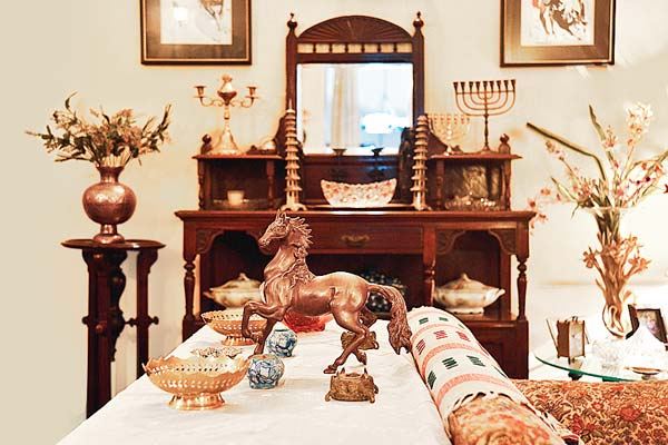 তার ছাপ বাড়ির সর্বাঙ্গে। কাঠের অসাধারণ আসবাব বেশির ভাগই বার্মাটিকের। কিছু কিছু ইউরোপিয়ান মেহগনির। দেওয়ালে বাঁধানো ছবির সঙ্গে চোখে পড়ল অদ্ভুত ক’টি জিনিস। স্ক্যান্ডিনেভিয়া থেকে পাঠানো পোস্টকার্ড, প্রাচীন ন্যাভিগেশন ম্যাপ, লিথোগ্রাফ, জাপানি হ্যান্ডপ্রিন্টেড ব্রেসলেট, এমনকী এক সিন্ধুঘোটকের কঙ্কাল পর্যন্ত! ইন্টিরিয়ারে এহেন বিচিত্র জিনিসের সমাহার আকর্ষক বই কী!