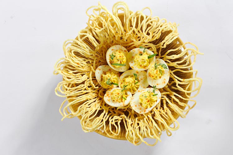 উপকরণ: সিদ্ধ ডিম ৩টি, মাস্টার্ড সস ১৫ মিলি, মেয়োনিজ ১৫ মিলি, ফ্রেশ ক্রিম ১০ গ্রাম, পার্সলে ১০ গ্রাম, নুন ২ গ্রাম, গোলমরিচ গুঁড়ো ৩ গ্রাম, সিদ্ধ নুডলস ৮০ গ্রাম, কর্নফ্লাওয়ার ৩০ গ্রাম, সাদা তেল প্রয়োজন মতো। ব্রথের জন্য: আদা ৫ মিলি, রসুন ৫ মিলি, পেঁয়াজ ১০ মিলি, লঙ্কা বাটা ২ মিলি, সয়া সস ২ মিলি, অ্যারারুট পাউডার ২ মিলি, কর্নফ্লাওয়ার ৫ মিলি, নুন, মরিচ গুঁড়ো স্বাদ মতো।