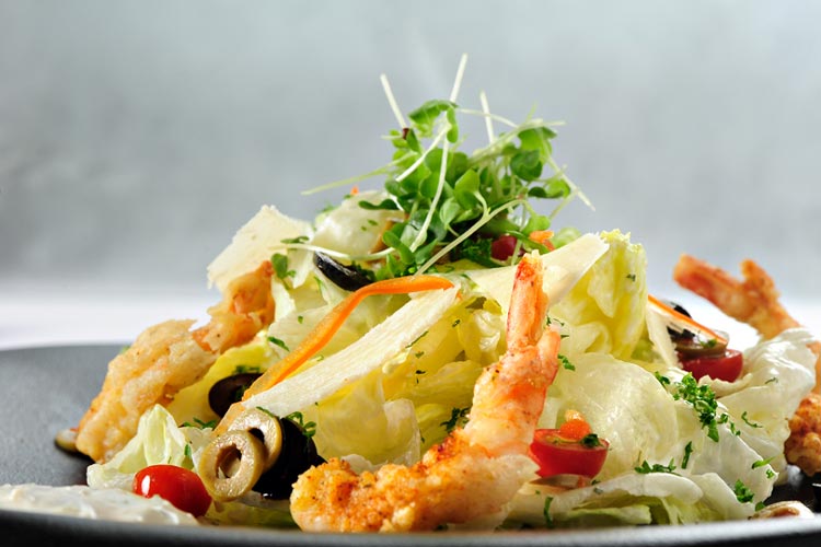 উপকরণ: আইসবার্গ লেটুস ৯০ গ্রাম, রোমেইন লেটুস ৬০ গ্রাম, পারমেজ়ান চিজ় ১০ মিলি, অলিভ ১০টি, সিজ়ার ড্রেসিং ৪৫ গ্রাম, চেরি টম্যাটো ৬টি, পার্সলে ৫ গ্রাম, চিংড়ি ৯০ গ্রাম, ময়দা ৬০ গ্রাম, বেকিং পাউডার ৫ গ্রাম, প্যাপরিকা পাউডার ১৫ গ্রাম, পার্সলে ৫ গ্রাম, পাতিলেবুর রস ১০ মিলি, নুন ৩ গ্রাম, গোলমরিচ গুঁড়ো ২ গ্রাম, সাদা তেল প্রয়োজন মতো, গার্লিক টোস্ট ২টি।
