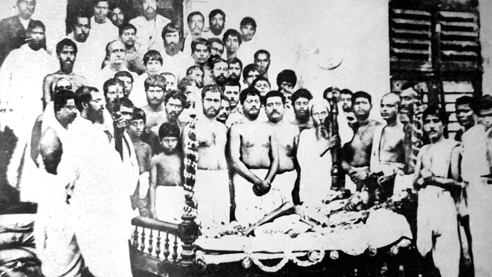 এর পরেই আসা যেতে পারে ডাক্তার মহেন্দ্রলাল সরকারের বিখ্যাত দিনলিপিতে। সোমবার সকালবেলাতেই তাঁকে খবর দেওয়া হয়েছিল, তিনি এলেন প্রায় একটার সময়ে, ডাফ স্ট্রিটের এক রোগিণীকে দেখে। তাঁর দিনলিপি—আমি তাকে মৃত দেখলাম—রাত একটায় তাঁর দেহাবসান ঘটেছে। তিনি বাম পাশ ফিরে শুয়ে ছিলেন। পদদ্বয় গুটানো, চক্ষুদ্বয় উন্মীলিত, মুখ কিঞ্চিৎ উন্মুক্ত। যাঁরা তখনও সমাধিভঙ্গের চেষ্টা করছিলেন, তাঁদের ভুল ভাঙানোর চেষ্টা করে ডা. সরকার বললেন, একটা ছবি নেওয়ার ব্যবস্থা করা যাক এবং সেই জন্যে নিজের ব্যাগ থেকে দশ টাকা বার করে দিলেন। সে দিন তোলা বেঙ্গল ফোটোগ্রাফারের দু’খানি ছবির ঐতিহাসিক মূল্য অনেক। কে সেখানে উপস্থিত এবং উপস্থিত নন, সে বিষয়ে যথেষ্ট অনুসন্ধান হয়েছে। অন্তিম শয়ানে রামকৃষ্ণের দু’টি ছবি নিয়ে এখনও বিস্তারিত অনুসন্ধানের সুযোগ রয়েছে। বিদেশি সন্ন্যাসী গবেষক স্বামী বিদ্যাত্মানন্দের টীকা— ‘শ্রীরামকৃষ্ণের পার্থিব শরীর একটি সুসজ্জিত খাটের উপর শয়ান। কিঞ্চিৎ বাম দিকে কাত হয়ে। মুখমণ্ডল অতীব শীর্ণ। চক্ষুদ্বয় অর্ধনিমীলিত এবং বাহুদ্বয় দেহের উপর স্থাপিত। দক্ষিণপদ বামপদের উপর ন্যস্ত। ললাটের উপর চন্দনের প্রলেপ এবং কণ্ঠে মাল্যরাজি। খাটটি ফুল ও মালা দিয়ে ঢাকা, খাটের চারকোণে মশারি টাঙানোর চারটি ছতরি। পশ্চাতে কাশীপুর উদ্যানটির কিয়দংশ দৃশ্যমান। বাঁ দিকে বিছানার একটা স্তূপ দেখা যাচ্ছে। সম্ভবত ঠাকুরের ব্যবহৃত, রৌদ্রে দেওয়া হয়েছে। প্রায় পঞ্চাশের বেশি ভক্ত ও সুহৃদ খাটের পিছনে দাঁড়িয়ে আছেন।’