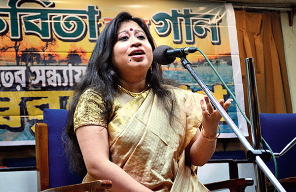 সম্প্রতি ‘স্বরক্ষেপণ’ নিবেদিত সান্ধ্য আসরটি হয়ে উঠল কবিতা ও গানের এক সুন্দর মেলবন্ধন। রবীন্দ্রনাথ থেকে শুরু করে আধুনিক সময়ের কবিদের ভিন্ন স্বাদের, ভিন্ন বৈচিত্র্যের কবিতায় সমৃদ্ধ ছিল সেই সন্ধ্যা। মালা দে’র ‘উত্তরাধিকার’ এবং ‘পঞ্চাশোর্ধ্বে বনে যাবে’ – মামুলি নিবেদন। উর্জস্বী মজুমদারের ‘বাংলাটা ঠিক আসে না’ অকারণে নাটুকে এবং চিৎকৃত। শুনতে ভাল লাগে রঞ্জনা মুখোপাধ্যায়ের কণ্ঠে দুটি কবিতা, সেরা-র কণ্ঠে ‘যমুনাবতী’, সায়ন ও পিয়ালীর যৌথ নিবেদনে ‘রংবদল’, ‘ডেকেছ আজি’, ‘চিল্কায় সকাল’। কবি তাঁর নিজের বই থেকে দুটি কবিতা পাঠ করলেন যা বর্তমান সময়ের পক্ষে প্রাসঙ্গিক, সময়োপযোগী। অনুষ্ঠানের শেষ নিবেদন ছিল কবিতা ও গানের একটি কোলাজ। অংশগ্রহণ করলেন বাসবদত্তা বসু মজুমদার এবং সুছন্দা ঘোষ। বাসবদত্তার আবৃত্তি তাঁর কণ্ঠ-সম্পদ, স্বরক্ষেপণ দক্ষতা ও আবেগময়তায় সমৃদ্ধ। তবে আবেগের সংযত বহিঃপ্রকাশও বাঞ্ছনীয়। উল্লেখযোগ্য কবিতাগুলি হল ‘ভেঙেছ দুয়ার’, ‘সেদিন কি তুমি’, ‘কোন বাণিজ্যে’। কবিতার সঙ্গে সাযুজ্য রেখেই ছিল সুছন্দার কণ্ঠে গান – ‘ঐ মহামানব’, ‘তুমি কোন্ পথে’, ‘এই লভিনু’, ‘যাবই আমি, এমনি করেই’।