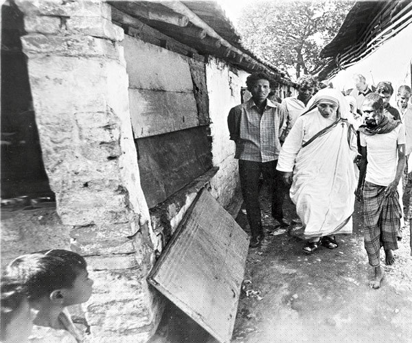 মাদার কিন্তু অবিচল। পায়ে পায়ে ঘুরে চললেন বস্তির এ-ঘর, সে-ঘর। তাদের দুর্দশা দেখে বেড়ালেন। এক জায়গায় এসে দেখলাম, একটা কিশোর কেমন যেন বিস্ফারিত চোখে মাদারের ভাবভঙ্গি হাঁটাচলা নজর করে চলেছে।