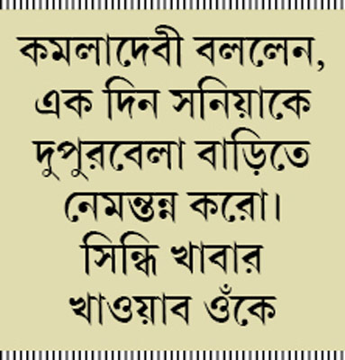 এর মাঝে কমলাজিকে দেখলাম, একেবারে অন্য এক প্রসঙ্গে চলে গিয়েছেন। বললেন, ‘‘এক দিন সনিয়াকে দুপুরবেলা বাড়িতে নেমন্তন্ন করো। সিন্ধি খাবার করে খাওয়াব ওঁকে।’’