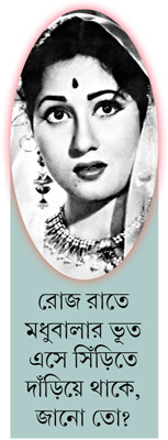 তার পরে বললেন, ‘‘একবারের কথা বলি। ট্যুরে যাবে ও। আমি থাকব বাড়ি। চলে যাওয়ার ঠিক আগে আমায় বলল, ‘দেখো, রান্নাঘরে যেন বেশি রাত করে নামতে যেয়ো না। খাবার জল-টল যা দরকার আগেভাগে ঘরে রেখে দিয়ো। রাত্তিরে আর বেরোতে যেয়ো না।’ বললাম, কেন? কী হবে তাতে? উত্তরে বলল, ‘আরে, রোজ রাতে মধুবালার ভূত এসে সিঁড়িতে দাঁড়িয়ে থাকে, জানো তো?’ শুনে আমার সে কী ভয়! ও তো বলে চলে গেল। এত ঘাবড়ে গেলাম, রাতে শোওয়ার সময় সেই-যে ঘরের দরজাটা দিয়ে দিতাম, হাজার দরকার পড়লেও সকালের আগে কিছুতেই খুলতাম না।’’