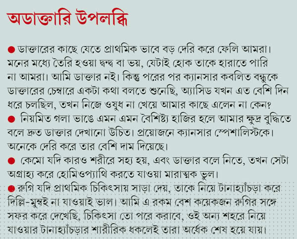 ফল জেনেশুনেই যে যুদ্ধ চালিয়ে যেতে হয়। যতক্ষণ না রোগী নিজে থেকে সব চিকিৎসার উর্ধ্বে চলে যান। পরিবারের সকলে জানপ্রাণ দিয়ে লড়েন। লড়তে তো হয়ই। তার মধ্যেই কেউ কেউ খোঁজ নেন ইতিমধ্যে বিদেশে কোনও ওষুধ বেরলো কিনা বা অন্য কোনও সুরাহা, কেউ বা আবার কখনওসখনও হোমিওপ্যাথি দেখানোর জন্য সওয়াল করেন।
