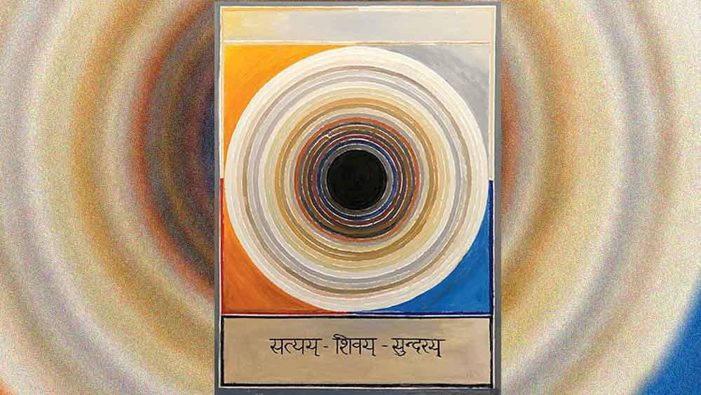 বর্ণোচ্ছ্বাসের বাহুল্যহীন বাহুল্যের একটা সীমানাকে তিনি প্রত্যক্ষ করান। যেখানে পটভূমির প্রধান রূপ, যা তন্ত্রময় বা শাস্ত্রীয় অনুপুঙ্খের সঙ্গে এক রকম ভাবে বর্তুলাকার ছন্দের সঙ্গে হাত ধরাধরি করে চলে ওই বর্ণবৈচিত্রের ভারসাম্য। আবার ছোট ভার্টিকাল বা হরাইজ়ন্টাল লাইনের সাদা-লাল বর্ণের উপরিভাগে অপেক্ষাকৃত দৃঢ় ও আয়তক্ষেত্রসদৃশ সাদা অংশটি গোটা ছবিটিকে চিহ্নিত করছে আর একটি নির্দিষ্ট প্রতীক হিসেবে। ‘ব্ল্যাক সান’ সেই হিসেবে রচনাগত ভাবে তাই কিছু প্রশ্ন তুলেও দেয়।