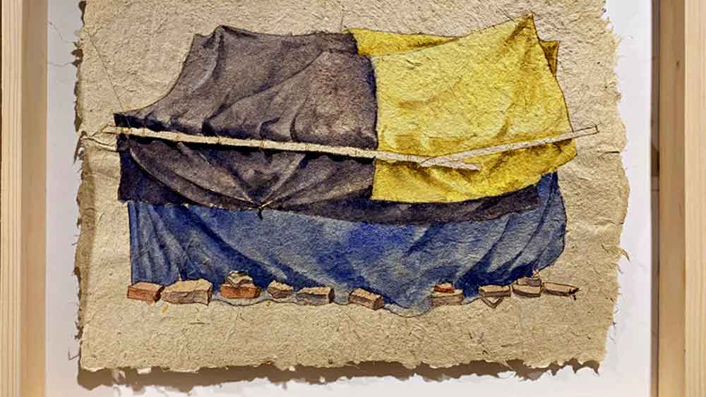 বাবলি পালের সংযত ছবিতে দেখি মেহনতি মানুষের কথা। কাগজের স্বল্প পরিসরে, তুলির নরম টানে যা ধরা পড়ে, তা শ্রম নয়— শ্রমিকের জীবনের প্রতি তাঁর সকরুণ মমত্ব। কখনও স্মৃতি, কখনও বসতি,কখনও পণ্য হয়ে ওঠে তাঁর ছবির বিষয়বস্তু। সেখানে মানুষের অবয়ব না থাকলেও কখনও ত্রিপলের তৈরি অস্থায়ী আস্তানায়, কখনও বা অবহেলায় পড়ে থাকা নিত্যব্যবহারের টিনের কৌটোয় মানুষের উপস্থিতি অনুভব করা যায়।