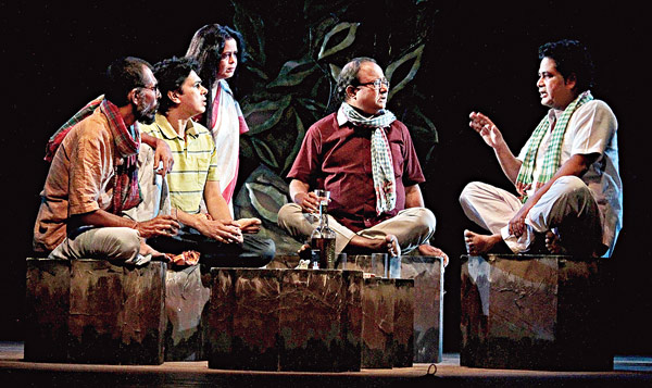 পাগলা ঘোড়া মৃত্যুর নাটক, আবার জীবনেরও। শ্মশানে এক তরুণীর মৃতদেহ পুড়ছে। আর চারজন শ্মশানবন্ধু সময় কাটাচ্ছে তাস খেলে, মদ খেয়ে আর নিজেদের জীবনের ব্যর্থ প্রেমের গল্পের বর্ণনায়। সাতু, হিমাদ্রি, শশী আর কার্তিক। সেই সব গল্প শুনছে চার পাশে ঘুরে বেড়ানো তরুণীর অতৃপ্ত আত্মা। মৃত্যুর পরেও কি জীবনের প্রতি মায়া, অতৃপ্ত বাসনা থেকে যায়? এই নাটকের শিল্পীরা এবং দর্শক খুব কম জনই বহুরূপীর আগের প্রযোজনার স্বাদ পেয়েছেন। তাই পুনরাবৃত্তি বা মিলিয়ে দেখার কোনও সুযোগ ছিল না। সুতপা একই সঙ্গে ওই মৃত তরুণীর ভূমিকায় অভিনয় ও পরিচালনার দায়ভার বহন করেছেন। তাঁর প্রশংসা করতেই হয়। কার্তিক ও সতুবেশী অলোকনাথ দে ও সৌম্য মজুমদার বেশ ভাল। আরও একটু মনোযোগী হতে হবে দীপঙ্কর হালদার ও প্রবীর আদিত্যতে। লছমি চরিত্রে আদিত্য দাশগুপ্তকে সুন্দর মানিয়েছে। বাকি দুই মহিলা চরিত্র কিছুটা আড়ষ্ট।
