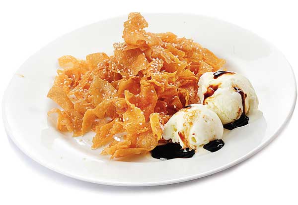 পদ্ধতি: ওয়ানটন শিটগুলোকে চওড়া (এক সেন্টিমিটার) করে কেটে নিন। কড়াইয়ে তেল গরম করে ওয়ানট মুচমুচ্ করে ভেজে নিন। এবার একটি আলাদা কড়াইয়ে মধু ও চিনি নিয়ে গরম করুন। চিনি ও মধু পরস্পরের সঙ্গে মিশে গেলে, এর মধ্যে ওয়ানটন স্ট্রিপগুলো দিয়ে, টস করে নিন, যাতে সিরাপটা ওই স্ট্রিপগুলোর গায়ে পরতের মতো লেগে যায়। এর উপর রোস্টেড তিল ছড়িয়ে ভ্যানিলা আইসক্রিমের সঙ্গে সার্ভ করুন। ভ্যানিলা আইসক্রিমের উপর চকোলেট সিরাপও ছড়িয়ে দিতে পারেন।