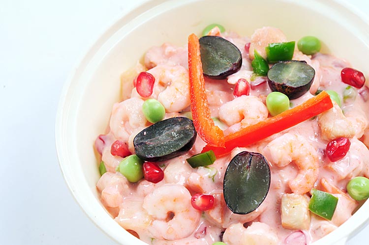 উপকরণ: ছোট চিংড়ি আধ কাপ, হাড়ছাড়া মুরগির মাংস আধ কাপ, বিন ৪ টেব্ল চামচ, আনারস ৪ টেব্ল চামচ, মেয়োনিজ ৪ টেব্ল চামচ, বেদানার রস ৩ টেব্ল চামচ, বেদানা ২ চা চামচ, কড়াইশুঁটি ২ চা চামচ, নুন স্বাদ মতো, গোলমরিচ গুঁড়ো আধ চা চামচ, সাদা তেল ২ টেব্ল চামচ, কালো আঙুর কয়েকটি।