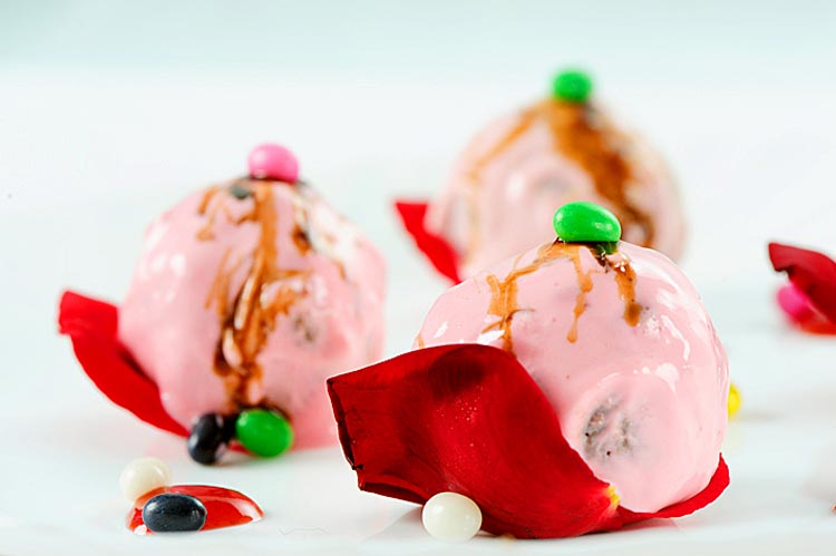প্রণালী: ময়দা, বেকিং পাউডার একসঙ্গে চেলে নিন। একটি বাটিতে চিনি গুঁড়ো, মাখন, ডিম একসঙ্গে ফেটিয়ে রাখুন। তাতে নুন, ভ্যানিলা এসেন্স, ময়দা, বেকিং পাউডার, কোকো পাউডার মিশিয়ে কেকের ব্যাটার তৈরি করে নিন। আভেন-প্রুফ কেক টিনে ব্যাটার ঢেলে রাখুন। আভেন ১৮০ ডিগ্রি সেন্টিগ্রেড তাপমাত্রায় প্রি-হিট করে রাখুন। ওই একই তাপমাত্রায় কেক আধঘণ্টা বেক করে নামিয়ে নিন। কেক ঠান্ডা হয়ে গেলে হাল্কা হাতে গুঁড়ো করে নিন। কেকের গুঁড়োর সঙ্গে ফ্রেশ ক্রিম মিশিয়ে ছোট ছোট গোলাকার করে গড়ে তুলুন। অন্য একটি পাত্রে হোয়াইট চকলেট গলিয়ে নিন। চকলেটের সঙ্গে স্ট্রবেরি সিরাপ মিশিয়ে নিন। চকলেটের গায়ে গোলাপি রং ধরবে। এ বার কেকের বলগুলো চকলেটের গোলায় ডুবিয়ে বেকিং ট্রে-তে রাখুন। প্রতিটা বলের উপর অল্প করে ক্রিম ছড়িয়ে ফ্রিজে ঢুকিয়ে ঠান্ডা করে নিন। বলগুলো জমে গেলে, উপর থেকে চকলেট সিরাপ আর স্প্রিঙ্কলার ছড়িয়ে দিন। এ বার গোলাপের পাপড়ির উপর বলগুলো রেখে পরিবেশন করুন লাভ বলস।