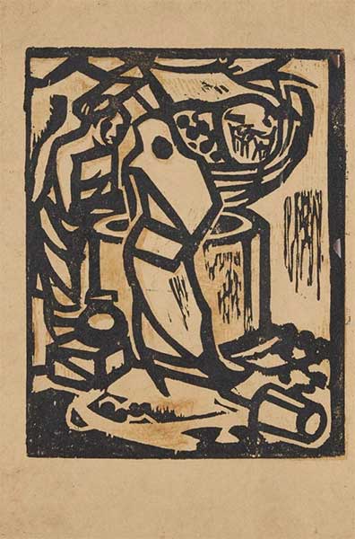এ ছাড়াও এখানে কাগজের উপরে কিছু এচিং, লিথোগ্রাফ এবং সেরিগ্ৰাফ (সিল্ক স্ক্রিন)-এর ছাপাই ছবি দেখা গেল। তা ছাড়াও আছে দু’টি উডকাট। একটিতে মনুষ্য-পরিচালিত মুরগির লড়াই। বেশ প্রাণবন্ত রঙের ব্যবহার। অপর উডকাটটিতে গ্রামের এক দৃশ্য। এক অল্পবয়সি মহিলা আর একজন বয়স্ক মহিলার সঙ্গে জল তুলতে গিয়ে কুয়োর সামনে দাঁড়িয়ে গল্পগুজব করছে। ওদের অবয়বের সামান্যতম ভঙ্গিমায় যেন বোঝা যায় যে, আসলে ওরা পরচর্চারত।