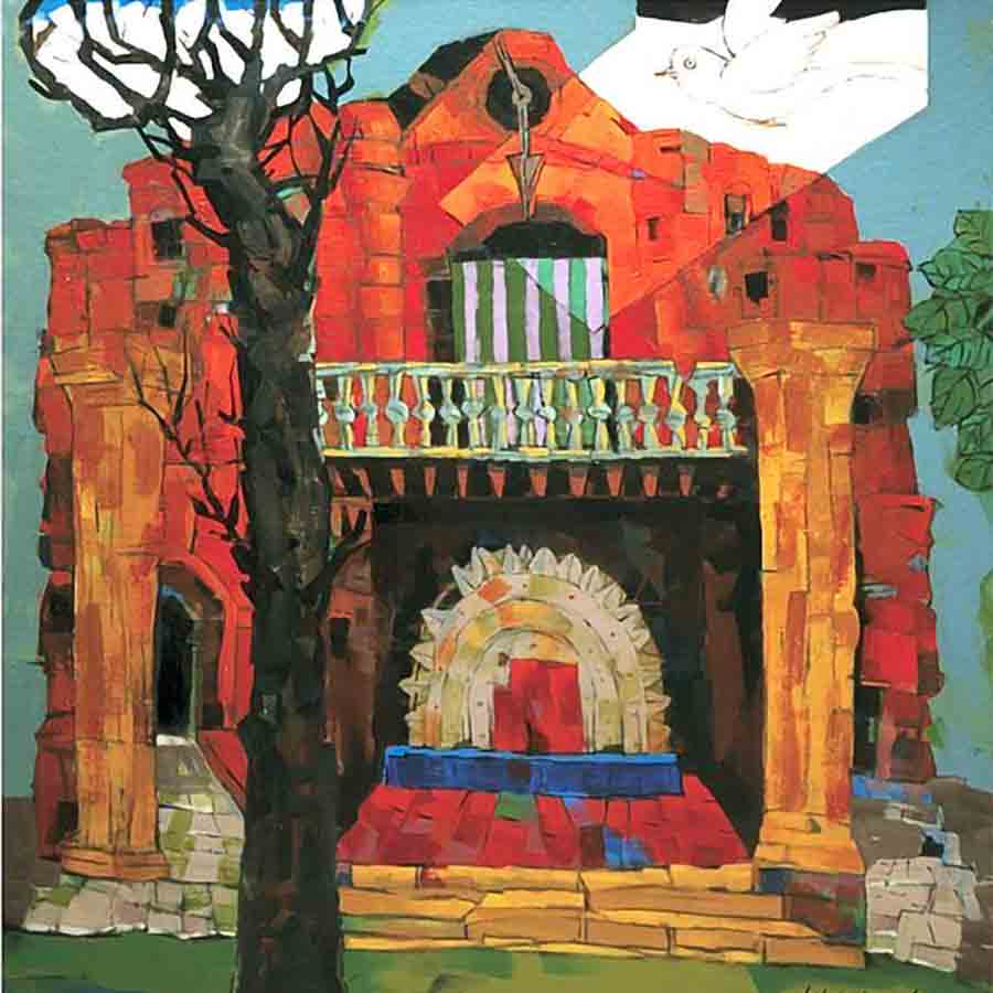 অশোকের ছবিতে কাটা কাটা মুখ, টুকরো রঙের সঙ্গে আবার কোথাও একটা জোরালো ফ্ল্যাট রং অদ্ভুত সাহসিকতার পরিচয় দেয়। এই ব্যাপারটা কিছুটা যেন ইমপ্রেশনিস্টদের থেকে বেরিয়ে পল গগাঁর ‘দ্য ডে অব দ্য গড’ বা তাঁর নিজের প্রতিকৃতির কথা মনে করায়। কিন্তু আবার অশোক মল্লিকের বেশির ভাগ কাজে ভিসুয়াল অংশ মাত্র একটা থাকে না। একাধিক অংশ সুদক্ষ ভাবে জুড়ে যেন দর্শককে অন্য কোনও কথা ভাবতে বাধ্য করেন শিল্পী। এখানেই তাঁর আঙ্গিক সম্পূর্ণ ভাবে নিজস্ব। এই প্রসঙ্গে ওঁর ‘বারাণসী’ ছবিতে আমরা দেখি, সে শহরের প্রতীক একটি ষাঁড়ের প্রতিকৃতি। সামনে স্ট্রোকে কাজ করেছেন, কিন্তু কাশী বলতে মানুষ যে গঙ্গা বোঝে, সেই গঙ্গা হলুদ রঙে ফ্ল্যাট ভাবে রঞ্জিত এবং বেঁকে চলে গিয়েছে সেই সুদূরে, যেখানে বারাণসী শহরের ছোট ছোট বাড়িঘর দৃশ্যমান। ভাবনাটি চমৎকার।