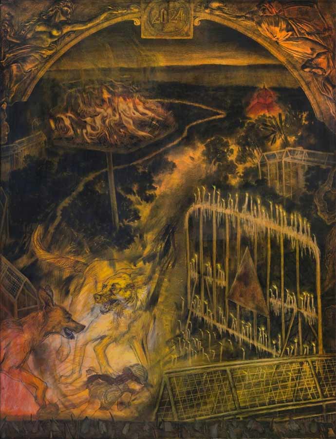 বিশিষ্ট চিত্রশিল্পী গণেশ হালুইয়ের কাজের সামনে ভাষা স্বতঃস্ফূর্তভাবেই নীরব হয়ে আসে। বাস্তব ও বিমূর্ততার সীমা অতিক্রম করে তিনি যে স্পেস নির্মাণ করেন, সেখানে রঙের মিতব্যয়িতা এক গভীর সুর তোলে। প্রদর্শনীতে পাখির অবয়ব কেবল চিহ্ন নয়, এক অন্তর্গত গমন। লালুপ্রসাদ সাউয়ের কালি-কলমের পার্শ্ববর্তিনী এবং পঙ্কজ পানোয়ারের মিশ্র মাধ্যমের বৃদ্ধ একটি যুগের প্রতিনিধি।
