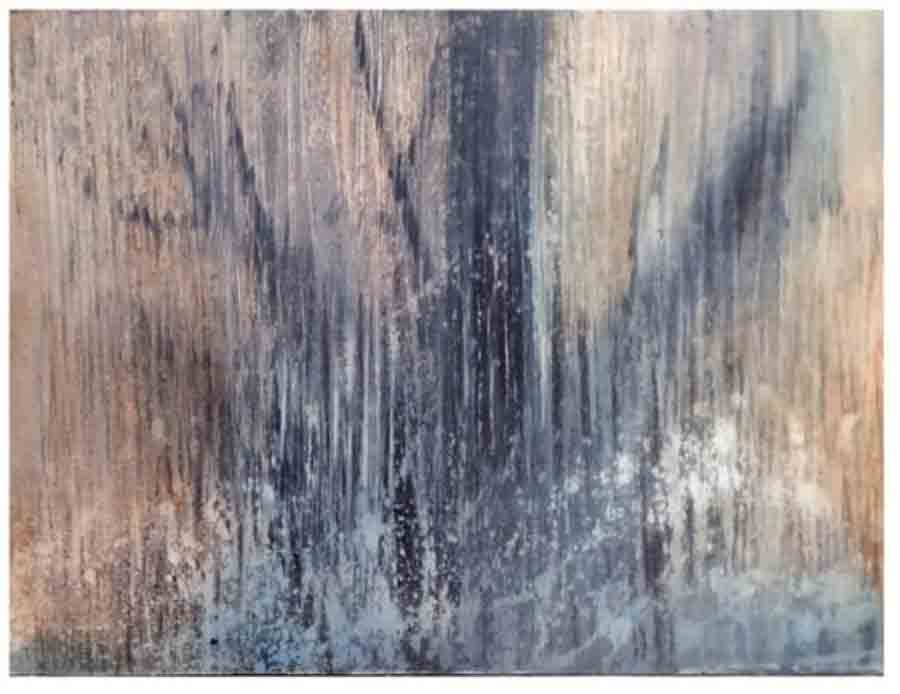 ‘ল্যান্ড’ বা জমি— এই মোটিফ প্রদর্শনীর প্রায় প্রতিটি কাজেই প্রতিধ্বনিত। নগর কলকাতার মাটির উপরে যে নিরবচ্ছিন্ন আঘাত চলছে— উচ্চভবন, দখল, ভাঙচুর, পুনর্গঠন— তার মানবিক প্রতিফলন তাঁর ছবিতে অনুরণিত। কোথাও জমির অবস্ট্রাকশন আকাশ পর্যন্ত ছড়িয়ে পড়েছে, কোথাও বা রঙের স্তরে স্তরে জমেছে অস্থিরতার চাপা আর্তি। মাটি যেন আর স্থির নেই— তার উপর দাঁড়িয়ে থাকা মানুষও তাই অনিশ্চিত।