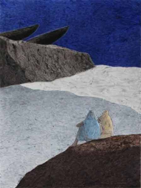 চন্দন দেবনাথ প্রকৃতি এবং মানুষের গভীর সম্পর্কের রহস্য ভেদ করতে চান তাঁর কাজে। মধুর রঙে রং মিলিয়ে প্রকৃতিতে যেন এক শব্দসঙ্গতি খোঁজেন। নদী, গাছ, কুঁড়েঘর, পাহাড় সবই অদ্ভুত এক সম্পর্কে ধরা দেয়, যে সম্বন্ধ আপাতদৃষ্টিতে সহজ-সরল। কিন্তু আসলে এক মিশ্রিত ভাবের প্রতিধ্বনি সঞ্চারিত হয় ছবিগুলিতে। সহজ হয়েও তাদের আপেক্ষিক সম্পর্ক গূঢ়। একটি ছবিতে নদী এবং পাহাড়ের দিকে তাকিয়ে দুই নারী, কিন্তু পিছন দিক থেকে দেখানো হয়েছে তাদের। কিছুটা যেন এই ছবিতে ঢুকে পড়তে চাইবেন দর্শক। কী ভাবছেন এই দুই মহিলা? কোন যাত্রার অপেক্ষায় আছেন? কারণ সামনের টিলার উপরে দু’টি নৌকোর সামান্য অংশটুকু দৃশ্যমান। অ্যাক্রিলিক এবং ক্রেয়নে-কাগজে আঁকা অনবদ্য ছবি।