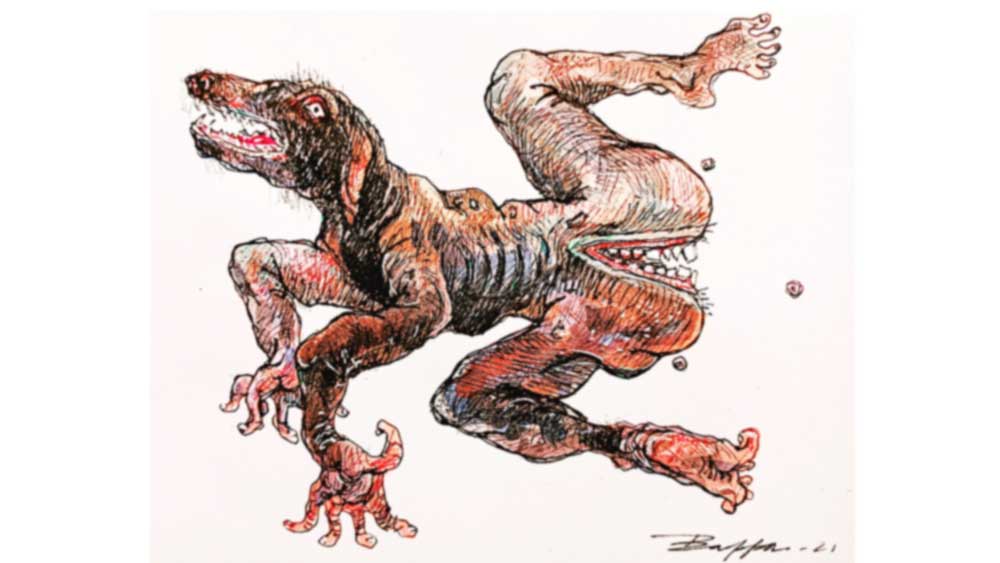প্রায় সাড়ে ৫০০ বছর আগে ডাচ চিত্রকর হিয়েরোনিমাস বসের পেন্টিংয়ে অদ্ভুত ও অত্যাশ্চর্য সব রূপ দেখা গিয়েছিল। সাররিয়ালিজ়মের সেই তো এক ধরনের সূত্রপাত বলা যায়। যদিও ইউরোপে তার প্রায় ৪০০ বছর পরে সাররিয়ালিজ়মের আবির্ভাব। বাপ্পার ড্রয়িংগুলিকে নির্দ্বিধায় বলা যায়, এ-ও এক ধরনের অধিবাস্তববাদেরই নামান্তর। কাজগুলি কোনও কমপ্যাক্ট কম্পোজ়িশন নয়। সহজেই কোনও অলৌকিক বা বিচিত্র গল্পগাথার সঙ্গে দিব্যি ইলাস্ট্রেশন বলে চালিয়ে দেওয়া যায়। একটি স্বাভাবিক রূপের কোনও অংশকে ভেঙে, দুমড়েমুচড়ে, অন্যান্য অঙ্গপ্রত্যঙ্গের অংশের মধ্যে প্রবেশ ঘটিয়ে রূপান্তর করেছেন। মানুষ, পশুপাখি, জন্তুর অদ্ভুত বাঁকাচোরা শরীরী বিভঙ্গ। এ সবই কিন্তু ওই সমাজ, সভ্যতা, জীবনযাপনের উপর করোনার নখর, নৃশংস থাবায় ছিন্নভিন্ন করে দেওয়া ভাবনাচিন্তার এক-এক রকম সাব-কনশাস। রঙিন রেখায় ও সাদাকালো রেখাঙ্কনে।