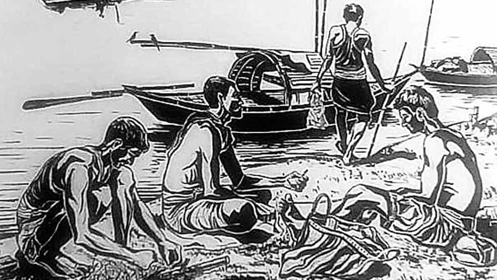 বর্তমান প্রদর্শনীতে বিনোদবিহারীর চারটি অসাধারণ কাজ ছিল। একটি পাতলা বাদামি জলরঙের টোন দেওয়া কাগজে তিনি নিজের নাম-সহ লিখেছিলেন উপল, নীচে উৎপল, প্রবীর, অসিত, রামানন্দ... এমন কিছু নাম। মকশো করার মতো, এক-একটি অক্ষর দু’বার, তিনবার করে লেখা। জানা নেই, তিনি এগুলি কোন সময়ে লিখেছিলেন। সাল-তারিখের কোনও উল্লেখ নেই। বাঁ-দিকের কোণে সংখ্যায় ‘৭’-এর নীচে ‘৭’লেখা। পরেরটি ইংরেজি নয়ের মতো করে লেখা, ফলে বোঝা মুশকিল। কালচে খয়েরি বর্ণের পেন বা নিব দিয়ে লেখা। ভারী চমৎকার একটি কোলাজ করেছিলেন তিনটি অবয়ব-সহ। এখানে জলরঙের কিছু ব্রাশিং ও সরু রেখার সঙ্গে টুকরো কাগজও আছে। তবে কিছু কাগজে জলরঙের টোন দিয়ে সেই কাগজকে কেটে, সামান্য ছিঁড়ে ব্যবহার করেছেন। এ রকম অন্য কাজটিতে খবরের কাগজ কেটে-ছিঁড়ে একই ভাবে কাজ করেছেন। আর শুধু রেখায় ন’টি প্যানেলের ড্রয়িংটি রামায়ণের।