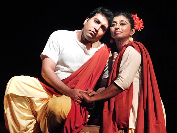 প্রায় এক দশক ধরে কলকাতার মেনস্ট্রিম থিয়েটারের পাশাপাশি সমান্তরাল এক ধরনের অভিনয় নিষ্ঠার সঙ্গে করে চলেছে দমদমের ঊহিনী কলকাতা। অদ্রিজা দাশগুপ্ত যে থিয়েটারে বিশ্বাস করেন, চলতি থিয়েটারের থেকে অনেকটাই আলাদা। সম্প্রতি মঞ্চস্থ হল রবীন্দ্রনাথের প্রতিবাদ প্রতিরোধের নাট্যভাষা ‘বেজে ওঠে পঞ্চমে স্বর’। ১৮৯০ থেকে শুরু করে জীবনের শেষ পর্যন্ত রবীন্দ্রনাথ ভারতীয় ও বিশ্বরাজনীতির গতিপ্রকৃতির সঙ্গে দ্বান্দ্বিক সম্পর্কে বিশ্ব জুড়ে ঘটে চলা অন্যায়, শোষণ, সাম্রাজ্যবাদী আগ্রাসন প্রভৃতির বিরুদ্ধে যে সব বক্তব্য রেখেছেন, কিংবা প্রতিবাদে গর্জে উঠেছেন—তা নিয়েই নাট্যনির্মাণ করেছেন অদ্রিজা দাশগুপ্ত ও সেঁজুতি বাগচী। কখনও ‘বিসর্জন’-এর হত্যা- রাজনীতির বিপরীতে জয়সিংহ-অপর্ণার প্রেম। কখনও ‘মুক্তধারা’য় যন্ত্রের প্রতাপ ও জাতীয়তাবাদের দম্ভের বিরুদ্ধে রবীন্দ্রনাথের অবস্থান। কখনও ‘রক্তকরবী’ রাজার বিশ্বজোড়া শোষণের জাল, প্রাণের সংকট এবং তা থেকে প্রতিবাদে গর্জে ওঠা নন্দিনীর লড়াই, ফাগুলালের নেতৃত্বে বন্দিশালা ভেঙে ফেলা জনতার লড়াইয়ে নামা। আবার সেখান থেকেই ‘রথের রশি’তে শূদ্রদের উত্থান ও ছোটদের বড় হয়ে ওঠা, দিনবদলের বাস্তবতায় উত্তরণ। এই নাট্যনির্মাণে ব্যবহার করা হয়েছে রবীন্দ্রনাথের অনেক গদ্যের কোটেশন। অদ্রিজার কাজের ধরনে আছে ইমপ্রোভাইজেশনের দক্ষতা। একক চরিত্রাভিনয় নয়, চরিত্র থেকে চরিত্রে, সংলাপ থেকে গানে, কখনও নৃত্যে, সেখান থেকে পাঠে—প্রতি মুহূর্তে তৈরি হতে থাকা বিমূর্ত সব নাট্য-ইমেজে দর্শকদের স্তব্ধ করে দেন। থিয়েটার এখন আর বিশেষ ছাঁদের আইডেনটিটিতে বাঁচে না। অদ্রিজার মতো থিয়েটারকর্মীরা তাই অচিরেই খুঁজে নেবেন এক নতুন পরিসর।
