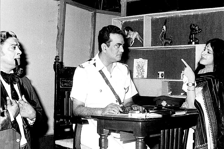 (বাঁ দিক থেকে) এন বিশ্বনাথন, অজিতেশ, কল্যাণী মণ্ডল। ‘থানা থেকে আসছি’ নাটকে