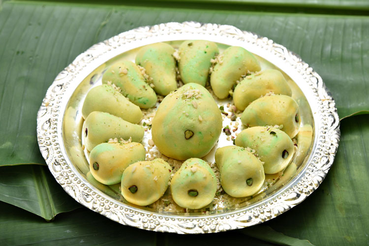 প্রণালী: আমের পাল্প ফোটাতে থাকুন। তাতে সন্দেশ দিয়ে নাড়ুন। ঘন হয়ে গেলে নামিয়ে নিন। এই সন্দেশ ঠান্ডা করে তিনটি সমান ভাগ করুন। একটি ভাগ বাসন্তী ও আর একটি ভাগ সবুজ রং দিয়ে মাখুন। বাকি ভাগটি সাদাই থাকবে। এ বার সন্দেশের সাদা, সবুজ ও হলুদ ভাগ তিনটি একসঙ্গে মাখুন। তা থেকে ছোট ছোট লেচি কেটে আমের আকার দিন। সেই সন্দেশের ভিতরে আমের পাল্প ভরে আবার সন্দেশ দিয়ে পূরণ করে দিন। বোঁটা হিসেবে পেস্তা লাগিয়ে দিন।