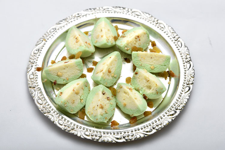 উপকরণ: ৫০০ গ্রাম সন্দেশ, সবুজ রং কয়েক ফোঁটা, চারমগজ কয়েকটি, আতর কয়েক ফোঁটা।