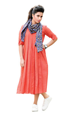 বোট নেক প্লিটেড অ্যান্টিফিটেড ড্রেসের সঙ্গে বাটিক ডটেড স্কার্ফ