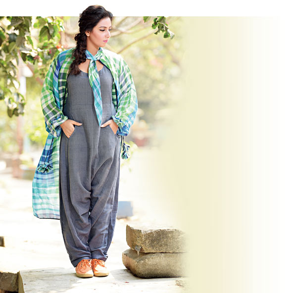 হ্যান্ডলুম ডেনিম ও খাদি ফ্যাব্রিকে লো ক্রোচ জাম্পসুটের সঙ্গে গামছা চেকের লিনেন শ্রাগ