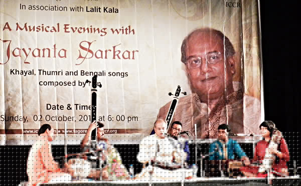 ললিতকলা ও আইসিসিআর-এর যৌথ উদ্যোগে শুরুতেই শোনা গেল হংসধ্বনি রাগে ‘বরদে বীণাপাণি’। পরে মধুবন্তী রাগে খেয়াল ধরলেন জয়ন্ত সরকার। প্রথমে বিলম্বিত একতালে নিজের তৈরি বন্দিশ ‘কাহে সতাও মোহে’, এবং পরে দ্রুত তিনতালে ‘যা রে যা রে পাপিহা’-র মধ্যে মুলতানির আভাস মেশানো রাগটির সার্থক রূপায়ণ শোনা গেল তাঁর কণ্ঠে। সোহিনী রাগে পরিবেশিত ঠুমরি ‘অব না যাও মোরে সইয়া’-র মধ্যেও রইল দক্ষতার পরিচয়। দ্বিতীয়ার্ধে বাংলা গান শোনালেন সংস্থার চার ছাত্রছাত্রী। শ্রেয়াণ, রূপরেখা, দেবাঞ্জনা ও সোনাক্ষী। বিশেষভাবে উল্লেখ করতে হয় শ্রেয়াণের গলায় রাগেশ্রী-তে আধারিত ‘বাজিছে এ কী সুর আজি তোমার বীণার তারে’ গানটি।