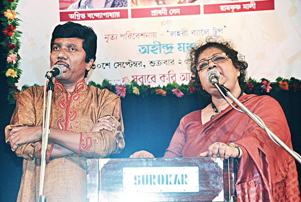 সম্প্রতি অহীন্দ্র মঞ্চে শোনা গেল শ্রাবণী সেন ও অগ্নিভ বন্দ্যোপাধ্যায়ের গান। শুরুতেই এ দিন ‘প্রথম আদি তব শক্তি’ গানটি দৃপ্ত ভঙ্গিতে যথার্থভাবে ফুটিয়ে তুললেন শ্রাবণী।