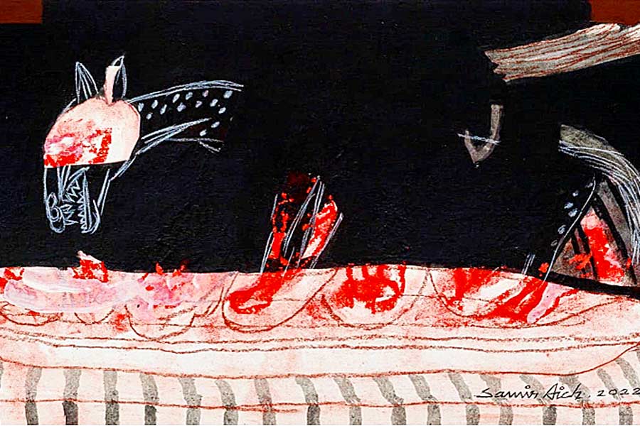 সমীর আইচের ‘নৈশ ভোজ’ বা ‘ডিনার’ ছবিতে মানুষের জন্য তৈরি ভোজ খাচ্ছে একটি কুকুর জাতীয় প্রাণী বা প্রাগৈতিহাসিক কোনও জানোয়ার। করোনার সময়ে কাজটি করা বলে ভাবা যায় যে, প্রকৃতির ওই করুণাহীন অবতার মানুষকে পশু করে তুলেছে অথবা মানুষ বা পশুর আপাত তফাত মুছে দিয়েছে। কী সাঙ্ঘাতিক পরিবেশনা! কিন্তু বীভৎস নয় একেবারেই। ট্রিটমেন্টের বিশেষত্বে এবং মিশ্র মাধ্যমের জোরে ছবিটি আকর্ষক হয়ে উঠেছে।
