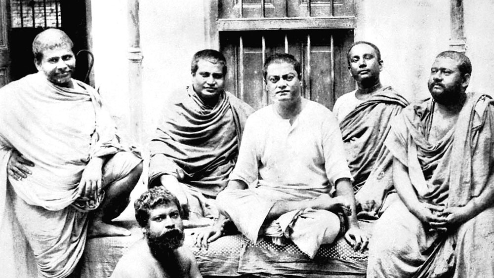 বলরাম বসুর বাড়িতে স্বামী ত্রিগুণাতীতানন্দ, স্বামী শিবানন্দ, স্বামী বিবেকানন্দ, স্বামী তুরীয়ানন্দ, স্বামী ব্রহ্মানন্দ (বাঁ দিক থেকে), স্বামী সদানন্দ (নীচে)
