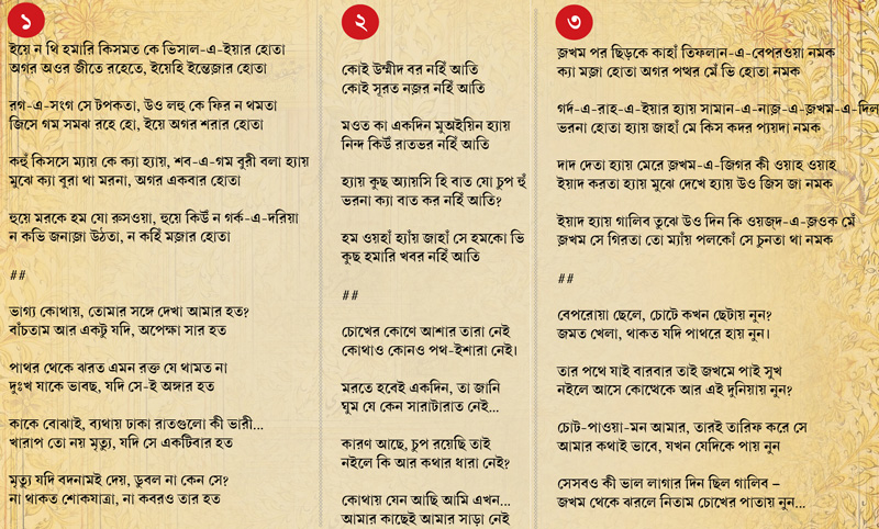 মির্জ়া গালিবের তিনটি গজল। অনুবাদক শ্রীজাতঅনুবাদ আসলে এক শিশি থেকে অন্য শিশিতে আতর ঢালার মতো। ঢালা যায় ঠিকই, কিন্তু অনেকটা সুগন্ধ মাঝের বাতাসে হারিয়ে যায়। বলেছিলেন কে যেন। আর স্বয়ং গালিবকে অনুবাদের চেষ্টা আমার কাছে স্পর্ধারই নামান্তর। তাঁকে যেটুকু পড়ি, মূল ভাষায় পড়েই বোঝবার চেষ্টা করি। উর্দু ভাষার নিজস্ব গঠনই এমন যে তার ভাবকে অনুবাদ করা গেলেও ভঙ্গিকে কখনওই যায় না। আর ভঙ্গি বা পেশ করার মেজাজটাই উর্দু ভাষাকে বাকিদের চাইতে রাজকীয় করে রেখেছে বলে আমার ধারণা।