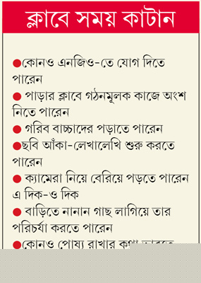 উ: যেমন, নিজের সৃজনশীল দিকটাকে পরিচর্যা করতে হবে। যাঁর যা কিছু ভাল লাগার জায়গা, তা সে ছবি আঁকা, ফুলগাছের পরিচর্যা, লেখালেখি যা-ই হোক না কেন, সেটাকে বাঁচিয়ে রাখতে হবে। রোজকার আড্ডার একটা গ্রুপ তৈরি করতে পারেন। সেই গ্রুপ নিজেদের মধ্যে গল্পগুজব করার পাশাপাশি এলাকার কোনও ভাল কাজেও অংশ নিতে পারে।