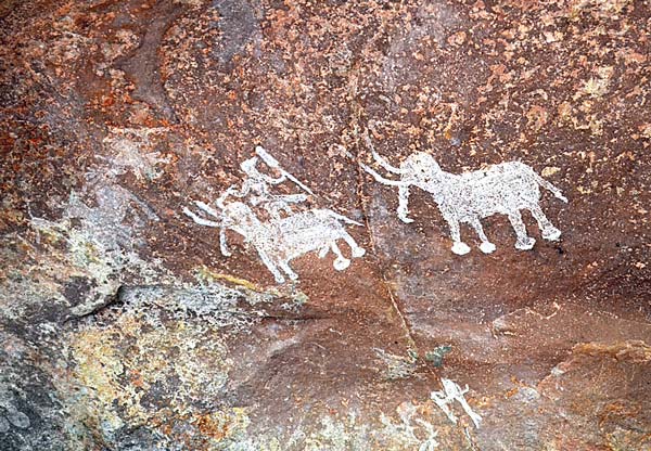 গুহাচিত্রের একেবারে পুরনো ছবিগুলোর মধ্যে রয়েছে মূলত বিশালকায় জন্তু। গন্ডার, বাইসন ইত্যাদি। বেশির ভাগই লালচে বা সবজেটে রঙের পাথর ঘষে আঁকা। আবার পরবর্তী সময়ের (মধ্য প্রস্তর যুগ) ছবিতে দল বেঁধে শিকারে যাওয়া মানুষ বা গৃহস্থালির ছবি। বোঝা যায়, দল বাঁধাটা মানুষের সহজাত। বেশ কিছু অস্ত্রের ছবিও দেখা যায়। অনেকটা ছোটবেলায় ইতিহাস বইয়ে পড়া ছবির মতো।