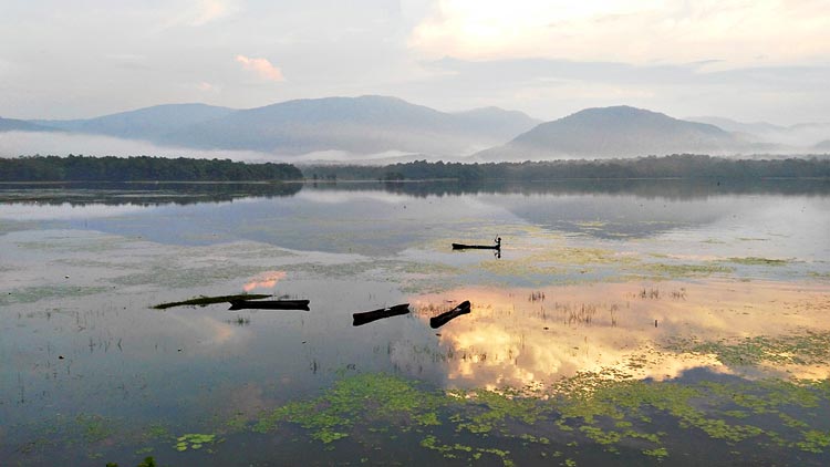 পথেই লাঞ্চ সারা হল। এ বার গন্তব্য কুলডিহা ফরেস্ট রেঞ্জের ঋষিয়া জলাধার। ঘণ্টাখানেকের পথ। বড় রাস্তা থেকে জঙ্গলে ঢোকার পর সেই লাল রাস্তা, আর ঘন সবুজ বন। কয়েক কিলোমিটার যাওয়ার পরে বনপথ শেষ হল। সামনে বড় মাঠ। আর গাড়ি যাওয়ার অনুমতি নেই। ফের ভরসা হাঁটাপথ। প্রায় ৫০০ মিটার। কিছু দূর এগোতেই চোখে পড়ল আদিগন্ত জলরাশি। বিভিন্ন ঝরনার জল এনে এখানে জমা হয়। চার দিকে পাহাড়ের মেলা। যত দূর চোখ চলে যায়, দেখি একের পর এক ধাপে ধাপে নেমে এসেছে পাহাড়ের দল। বেলা পড়ে আসছে। চার দিকে কেমন নীলচে আভা। নীল মেঘের সঙ্গে লুকোচুরি চলছে সূর্যের। রঙের খেলা চলল আরও কিছুক্ষণ। ধীরে ধীরে ড্যামের জলে কে যেন লাল আবির ছড়িয়ে দিল। তার মধ্যে জাল বিছিয়ে এগিয়ে চলেছে ডিঙি নৌকো। দাঁড়ের ছোঁয়ায় টুকরো টুকরো হয়ে যাচ্ছে জলছবি। মনে হচ্ছে শত শত পলাশকুচি ছড়ানো জলাধারের জলে। বেলাশেষে ফেরার পালা। গাড়ি করে শরীর ফিরল বটে। কিন্তু মন ফিরল কই?
