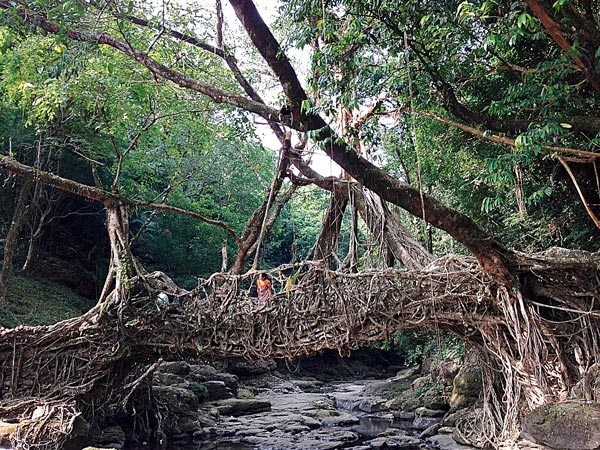 পাহাড়ে দিন শুরু হয় আগে। মেঘালয় পুবে বলে মনে মনে ঘড়ির কাঁটাকে এগিয়ে নেওয়া ভাল। প্রাতঃরাশ সেরে বেরিয়ে পড়া টায়ার্না গ্রামের দিকে। চেরাপুঞ্জি থেকে কুড়ি কিলোমিটার দূরে এই গ্রামে আছে বিখ্যাত ডাবল ডেকার রুট ব্রিজ। রবার গাছের শিকড় জড়িয়ে জড়িয়ে খাসি উপজাতিরা তৈরি করেছে নদী পার হওয়ার সেতু। নিয়মিত যাতায়াত তার উপর দিয়ে। তবে সমতলের মানুষকে সেখানে পৌঁছতে ঘণ্টা আটেকের ট্রেক! কোথাও পাথরের সিঁড়ি, কোথাও লোহার সরু লজঝড়ে ব্রিজ পেরিয়ে সবুজে ঘেরা প্রকৃতির কাছাকাছি। তবে শরীরের সামর্থ্য বুঝে তবেই ট্রেক। না হলে, গায়ের ব্যথায় বেড়ানোটাই মাটি হবে।