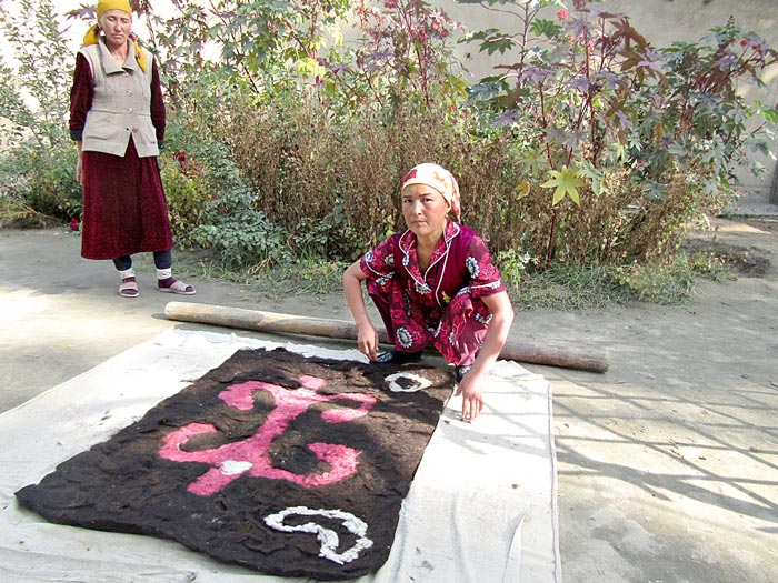 বেডেল গিরিপথ, চিন যেতে না-পারি, কিন্তু নালন্দার দেশ থেকে এসে ইসিক-কুল পৌঁছনো তো গেল! এখানে তামগা গ্রামে আমাদের রাত্রিবাসের ব্যবস্থা। বাড়ির এক দিকে গেস্ট হাউস, অন্য দিকে রান্নাবান্না ও বাড়ির লোকেদের থাকার ব্যবস্থা। ভদ্রমহিলা দু’-এক জন প্রতিবেশিনীকে নিয়ে কার্পেট বানান, ট্যুরিস্টদের বিক্রিও করেন। কিরঘিজ কার্পেট একেবারে অন্য রকম। ভেড়ার উলকে প্রথমে পিটিয়ে প্রায় সমতল করে দেওযা হয়। তার পর সেই চ্যাপ্টা উল শুকিয়ে নির্দিষ্ট আকার-আয়তনে এনে লাল-কালো কারুকাজ।
