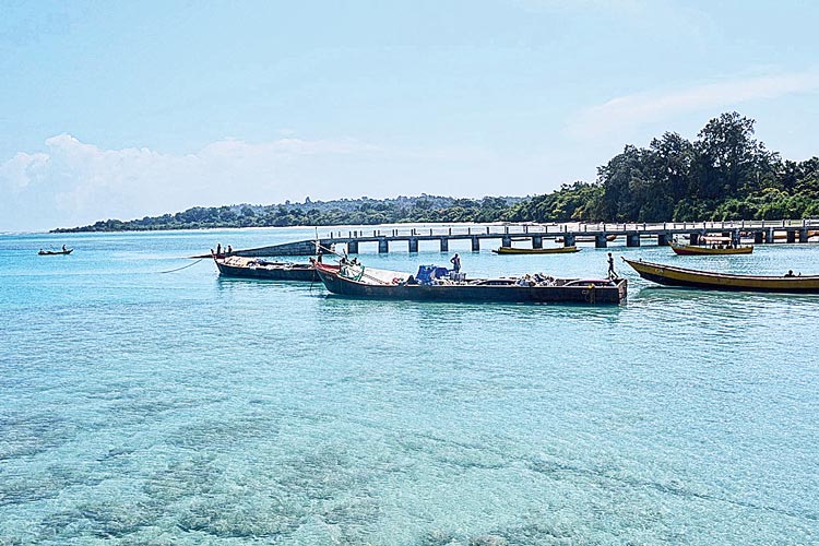 পরের গন্তব্য নীল আইল্যান্ড। এই ছোট দ্বীপটির জনসংখ্যা খুবই কম। এখানকার সৈকতে ছড়িয়ে অজস্র সাদা প্রবাল। ইতিউতি ছড়ানো নানা রঙের ঝিনুক, ছোট শাঁখ। এ সব অবশ্য সংগ্রহ করা নিষিদ্ধ। সন্ধের পরে সঙ্গী হল ঢেউ আছড়ে পড়ার শব্দ। পরদিন গেলাম প্রাকৃতিক পাথরের ব্রিজ দেখতে। স্থানীয়দের কাছে এটি পরিচিত ‘হাওড়া ব্রিজ’ নামে। এর পর পালা গ্লাস বটম বোটে প্রবাল দর্শন করার। নানা রঙের ও বিচিত্র আকৃতির প্রবাল, মাঝে আনাগোনা রঙিন মাছের। দেখা মিলছে সমুদ্রশশা জাতীয় সামুদ্রিক প্রাণীরও। অসাধারণ বললেও কিছু বলা হয় না। নৌকার দুলুনি ও জলের ঝাপটা অবশ্য ছবি তোলার চেষ্টায় দাঁড়ি টেনে দিল। পরে সূর্যাস্তের সঙ্গী হয়ে ফিরে এলাম পোর্ট ব্লেয়ারে।