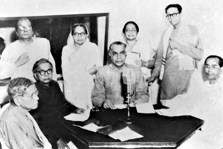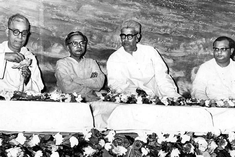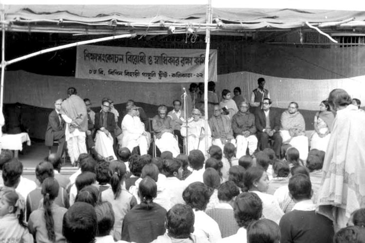 বামফ্রন্ট সরকারের শিক্ষা ও ভাষানীতির প্রতিবাদসভায় প্রমথনাথ বিশী। রয়েছেন সুকুমার সেন, প্রতুল গুপ্ত প্রমুখ। ছবি: তপন দাস