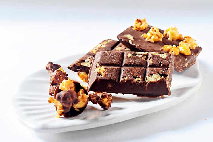 প্রণালী: চকোলেট বার ছোট ছোট টুকরো করে মাইক্রোওয়েভ আভেনে ৩০ সেকেন্ড দিয়ে গলিয়ে নিতে হবে। অন্য একটা পাত্রে চিনি গলিয়ে হালকা ক্যারামেলাইজ়ড করতে হবে। সোনালি রং এলে তার মধ্যে পপকর্ন দিয়ে ভাল করে মিশিয়ে নিন। এ বার একটা চকোলেট বার মোল্ড নিয়ে গলানো চকোলেট দিয়ে সেটা খানিকটা ভরতে হবে। এর মধ্যে পপকর্ন ভেঙে খানিকটা করে ভরে দেবেন। আর পট্যাটো চিপ্‌স গুঁড়ো করে ছড়িয়ে দিতে হবে। তার পর পুরো মোল্ডটা ফ্রিজে জমতে দিন। পুরো চকোলেট বার জমে গেলে মোল্ড থেকে বার করে কেটে কেটে পরিবেশন করুন।
