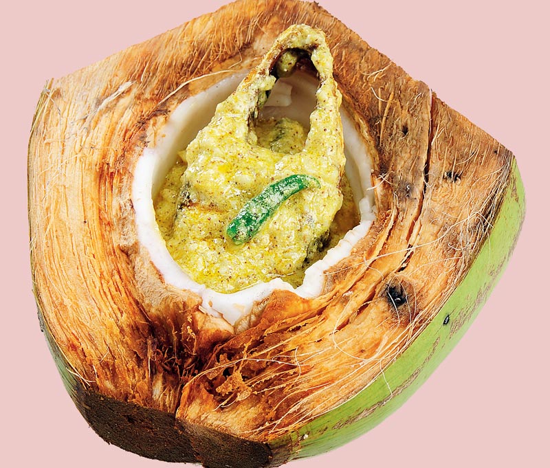 প্রণালী: মাছের গায়ে নুন মাখিয়ে মিনিট কুড়ি রেখে দিন। দু’টি ডাবের শাঁস বের করে বেটে রাখুন। সবচেয়ে বড় ডাবের শাঁস বের করে কুচিয়ে নিন। কড়াইয়ে তেল গরম করে, মাছের টুকরোর দু’পিঠ ৩০ সেকেন্ড করে ভেজে নিয়ে নামিয়ে নিন। একটি বাটিতে ডাবের শাঁস বাটা, শাঁসের কুচি, দু’রকম সরষে-পোস্ত-কাজু বাদাম বাটা, কাঁচা লঙ্কা, নুন, তেল মিশিয়ে রাখুন। ভাজা মাছ এই মিশ্রণে এক ঘণ্টা ম্যারিনেট করে রাখুন। ডাবের খোলায় মাছ পুরে ভাল করে ডাবের মুখ আটকে ফয়েলে মুড়ে নিন। কড়াইয়ে জল গরম করে ডাব ২৫ মিনিট স্টিমে রাখুন। ফয়েল খুলে ডাব ইলিশ পরিবেশন করুন।