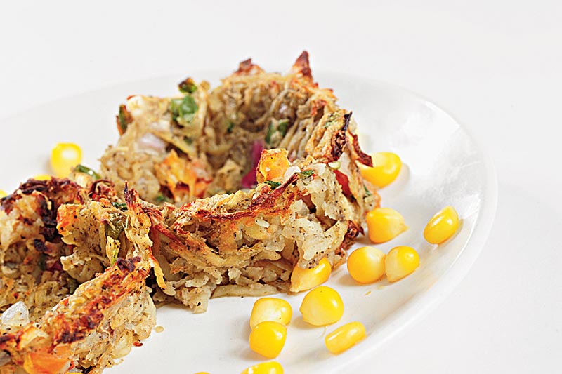 প্রণালী: প্রথমে খোসা ছাড়িয়ে আলু গ্রেট করে নিন৷ এক বাটি বরফ মেশানো জলে সেই গ্রেট করে রাখা আলু অন্তত আধ ঘণ্টা ভিজিয়ে রাখুন। এ বার আলু থেকে ভাল করে জল ঝরিয়ে নিন। একটি বাটিতে জলঝরানো আলুর কুচি, লাল ও সবুজ ক্যাপসিকাম কুচি, পেঁয়াজ কুচি, গোলমরিচ গুঁড়ো, নুন এবং কর্নফ্লাওয়ার একসঙ্গে মিশিয়ে ভাল করে মেখে নিন৷ তার পর কাপকেক বা মাফিনের মোল্ডের মধ্যে মাখন মাখিয়ে নিয়ে নানা উপকরণ মেশানো আলুর কুচি চেপে চেপে বসিয়ে, বাটির আকার দিন। এ বার ৩৫০ ডিগ্রি ফারেনহাইটে আভেন প্রি-হিট করে রাখুন। ওই একই তাপমাত্রায় আলুভরা কাপকেক বা মাফিন টিন অন্তত আধ ঘণ্টা বেক করে নামিয়ে নিন। এ বার আলতো করে মোল্ড থেকে আলু বের করে নিলেই তৈরি পটেটো নেস্ট। মেয়োনেজ মেশানো সুইট কর্ন, মশলামাখা ভাজা পনির অথবা যে কোনও ফিলিং ভরে পরিবেশন করতে পারেন পটেটো নেস্ট।