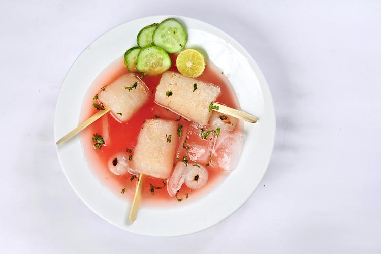 প্রণালী: লিচুর খোসা ও বীজ ছাড়িয়ে নিন। ডাবের শাঁস ও জল আলাদা করে রাখুন। মিক্সিতে একসঙ্গে লিচু ও ডাবের শাঁস মিহি করে বেটে নিন। একটি বড় বাটিতে লিচু-ডাবের শাঁস, ডাবের জল, নুন এবং চিনির সিরাপ একসঙ্গে মিশিয়ে নিন। এ বার মোল্ডে তা ভরে ফ্রিজে জমতে দিন। জমে গেলে ফ্রিজ থেকে পপসিক্ল বার করে উপর থেকে মিহি করে কুচোনো পুদিনা পাতা ছড়ান। ঠান্ডা ঠান্ডা পরিবেশন করুন লিচু-ডাবের পপসিক্ল।