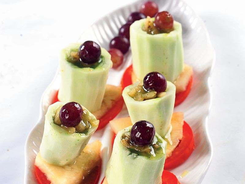 প্রণালী: খোসা ছাড়িয়ে একটি শসাকে গোল গোল চার টুকরো করে কেটে নিন। এক দিক বন্ধ রেখে শসার টুকরোগুলির ভিতর থেকে শাঁস কুরিয়ে বের করে নিন। পাতলা করার জন্য শসার বাইরের কিছু অংশ কেটে বাদ দিতে পারেন। এ বার কড়াই আঁচে বসিয়ে আনারস কুচি, চিনি আর পুদিনা পাতার পেস্ট নাড়াচাড়া করে নিন। আনারসের পুরে বিটনুন আর জলজিরা ছড়িয়ে সেটি শসার টুকরোগুলোতে ভরে নিন। পরিবেশন করার পাত্রে আম পান্না সিরাপ ঢেলে তার উপরে পুরভরা শসার টুকরো বসিয়ে দিন। প্রয়োজনে সাজানোর জন্য ব্যবহার করতে পারেন টম্যাটো, আনারস কুচি এবং চেরি।
