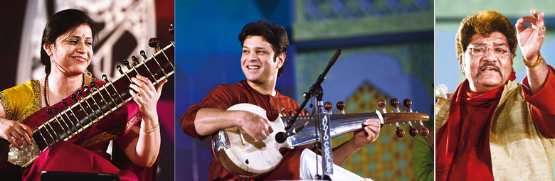 (ডান দিক থেকে)অনুপমা ভাগবৎ, আমান আলি খান ও শওকত হুসেন খান
