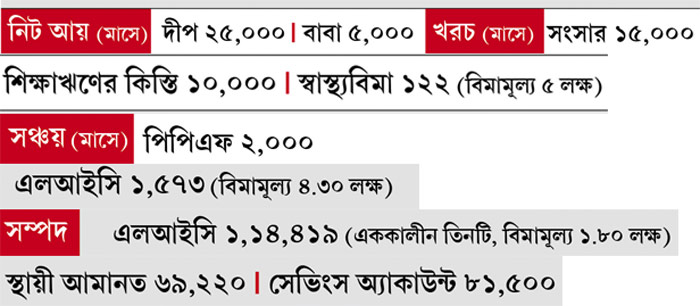 • যে-বিমাগুলির কথা তিনি জানিয়েছেন, তার মধ্যে বেশিরভাগই বাবা-মায়ের নামে। দীপের রয়েছে মাত্র ৩ লক্ষের বিমা। এককালীন ও চালু বিমা মিলিয়ে তাঁর পরিবারের মোট আটটি প্রকল্পের বিমামূল্য ৬.১ লক্ষ টাকা। যা খুবই কম।