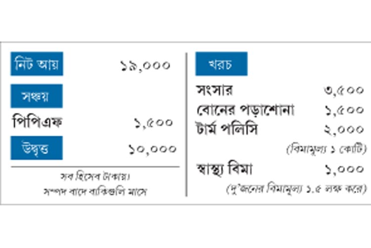 লক্ষ্য: স্বাস্থ্য বিমার কভারেজ বাড়ানো। বোনের ও নিজের বিয়ের জন্য টাকা জমানো। সন্তানদের উচ্চশিক্ষা। অবসর জীবনের জন্য সঞ্চয়। চালু করতে চান এসআইপি। গাড়ি ও বাড়ি কেনা