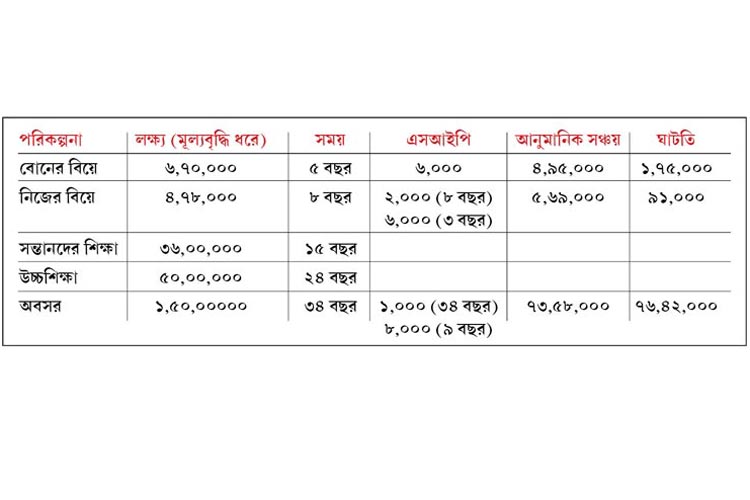তমালের বয়স অল্প। চাকরি জীবন সদ্য শুরু হয়েছে। কিন্তু এখনই ভবিষ্যতের জন্য যথেষ্ট পরিকল্পনা করে এগনোর চেষ্টা করছেন তিনি। রয়েছে সঞ্চয়ের মানসিকতাও। তিনি জানিয়েছেন, পাঁচ বছর পর বোনের বিয়ে দিতে চান। জমাতে চান ৫ লক্ষ টাকা। এর জন্য মাসে ৪,০০০ টাকা করে এসআইপি করতে চান। নিজের বিয়ের পরিকল্পনা আট বছর পর। তার জন্যও ৩ লক্ষ টাকা জমানোর লক্ষ্যমাত্রা নিয়েছেন। সেই টাকাও সঞ্চয় করতে চান এসআইপির মাধ্যমে। সন্তানদের শিক্ষার আনুমানিক খরচও ধরেছেন ভবিষ্যৎ পরিকল্পনার অঙ্গ হিসেবে। প্রাথমিক শিক্ষার জন্য ১৫ বছরে তিনি ১৫ লক্ষ টাকা জমাতে চান। উচ্চশিক্ষার জন্য ধরে রেখেছেন ৫০ লক্ষ টাকা। এমনকি অবসরের মতো সুদূর প্রসারী পরিকল্পনার একটা খসড়া উনি এখনই করে ফেলেছেন। আমাদের কাজ হবে এই সমস্ত খসড়াকেই একটু সাজিয়ে গুছিয়ে দেওয়া।