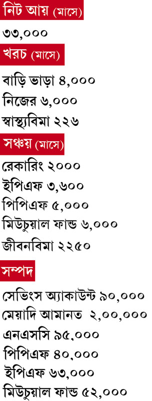 • সেভিংস অ্যাকাউন্টকে হেলাফেলা না-করা। বিপদ বলেকয়ে আসে না। আচমকা তেমন কিছু ঘটলে, টাকা জোগাড় করবেন কোথা থেকে? এমন পরিস্থিতিতে সব থেকে সহজ সেভিংস অ্যাকাউন্টের টাকা তোলা। অথচ অনেকেই ওই অ্যাকাউন্টে তেমন টাকা রাখেন না। লগ্নি কৌশলের প্রথম পাঠই হল, সেভিংস অ্যাকাউন্টে অন্তত তিন মাসের বেতন রাখা। এটা প্রশংসনীয় যে, দেবপ্রসাদের ওই অ্যাকাউন্টে প্রায় তিন মাসের বেতনই রয়েছে।